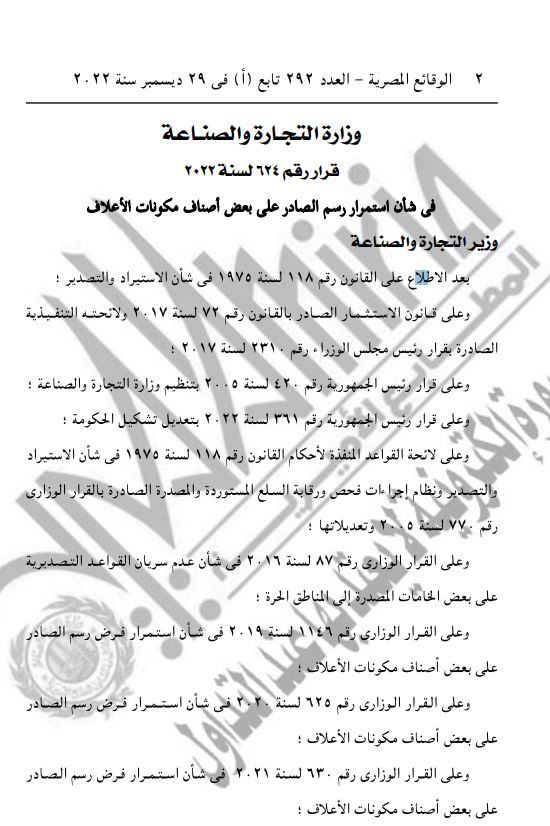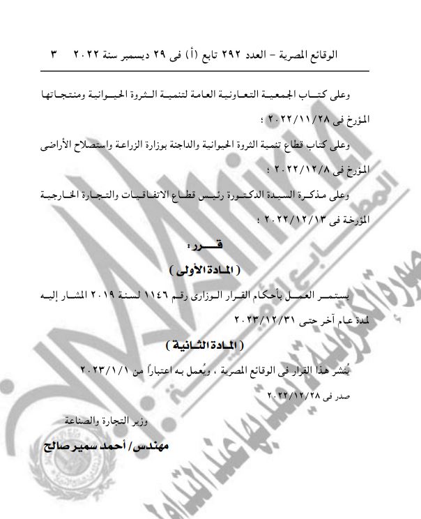 يذكر أن القرار الوزاري رقم 1146 لسنة 2019 ينص على فرض رسم الصادر المفروض على بعض أصناف مكونات الأعلاف الحيوانية بواقع 600 جنيه على طن قش وقشور الحبوب فيما عدا قش الأرز.