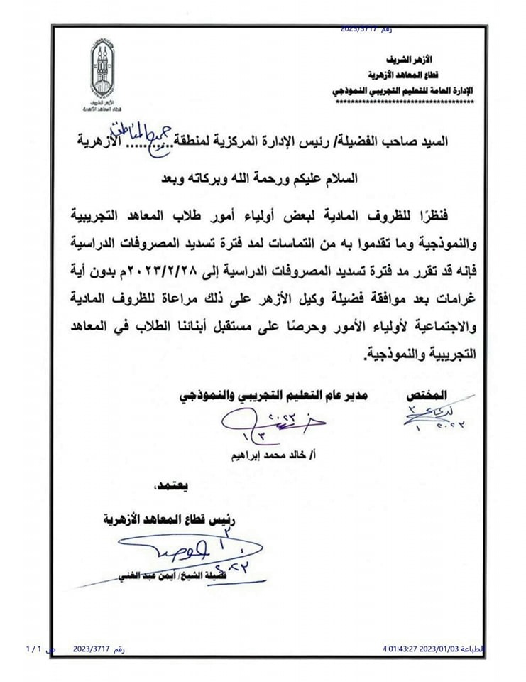 وأرسلت الإدارة العامة للتعليم التجريبي والنموذجي، منشورًا لرؤساء الإدارة المركزية لجميع المناطق الأزهرية، بخصوص القرار السابق، والذي جاء في نصه: نظرا للظروف المادية لبعض أولياء أمور طلاب المعاهد النموذجية وما تقدموا به من التماسات لمد فترة تسديد المصروفات الدراسية، فإنه قد تقرر مد فترة تسديد المصروفات الدراسية إلى 28/ 2/ 2023، دون أي غرامات، بعد موافقة وكيل الأزهر على ذلك، مراعاة للظروف المادية والاجتماعية لأولياء الأمور، وحرصا على مستقبل الطلاب في المعاهد التجريبية والنموذجية.