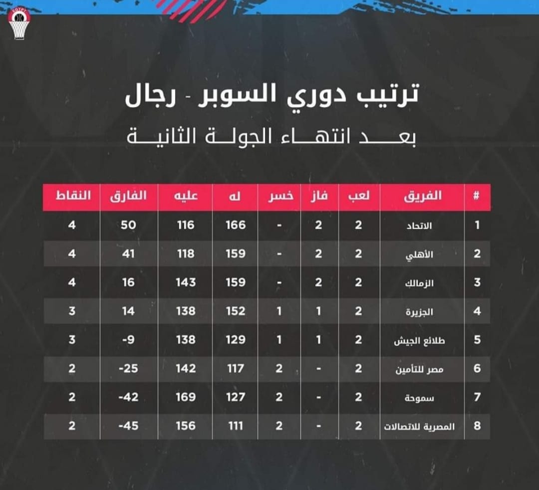 تصدر فريق الاتحاد السكندري جدول ترتيب المجموعة، بينما تذيل فريق المصرية للاتصالات المنافسات عقب نهاية الجولة الثانية، وتحديد المراكز من الأول إلى الثامن بدوري السوبر لكرة السلة رجال.