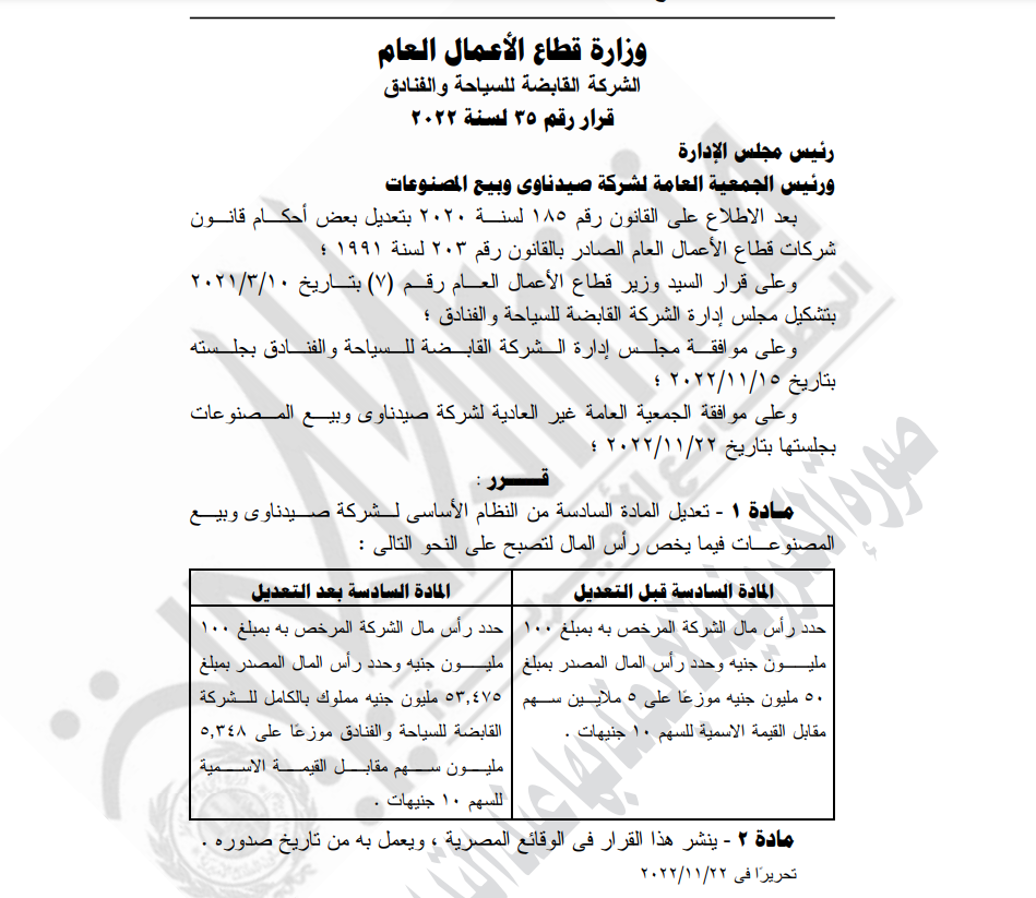 ووفق القرار رقم 35 لسنة 2022 المنشور بالوقائع الرسمية، فقد قررت مرفت حطبة رئيسة مجلس إدارة الشركة القابضة للسياحة والفنادق ورئيسة الجمعية العامة لشركة صيدناوي وبيع المصنوعات؛ تعديل المادة السادسة من النظام الأساسي لشركة صيدناوي وبيع المصنوعات، فيما يخص رأس المال لتصبح على النحو التالي: حدد رأس مال الشركة المرخص به بمبلغ 100 مليون جنيه، وحدد رأس المال المصدر بمبلغ 53.475 مليون جنيه مملوك بالكامل للشركة القابضة للسياحة والفنادق، موزعا على 5.348 مليون سهم مقابل القيمة الاسمية للسهم 10 جنيهات.