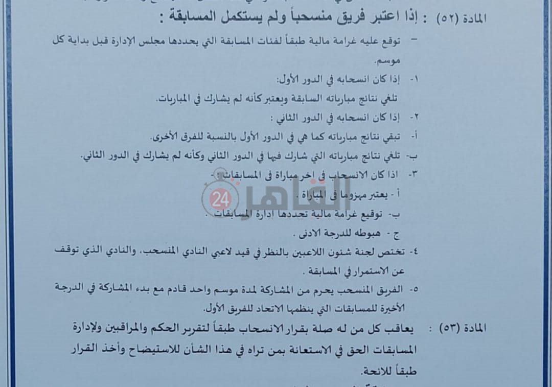 كما نصت اللائحة وتحديدًا المادة 53 على معاقبة كل من له صلة بقرار الانسحاب طبقًا لتقرير الحكم والمراقبين ولإدارة المسابقات الحق في الاستعانة بمن تراه في هذا الشأن وأخذ القرار طبقًا للائحة.