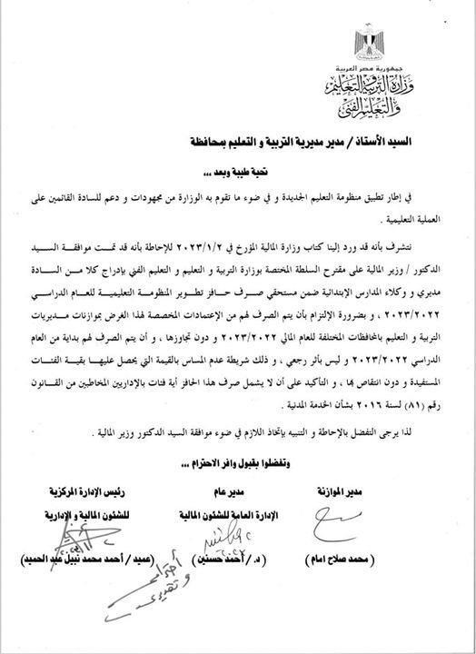 وأضافت الوزارة، في المنشور: نتشرف بأنه قد ورد إلينا كتاب وزارة المالية المؤرخ في 2/ 1/ 2023، للإحاطة بأنه قد تمت موافقة الدكتور محمد معيط وزير المالية، على مقترح السلطة المختصة بوزارة التربية والتعليم والتعليم الفني، بإدراج كلا من السادة مديري ووكلاء المدارس الإبتدائية ضمن مستحقي صرف حافز تطوير المنظومة التعليمية للعام الدراسي 2022/ 2023، وبضرورة الالتزام بأن يتم الصرف لهم من الاعتمادات المخصصة لهذا الغرض بموازنات مديريات التربية والتعليم بالمحافظات المختلفة للعام المالي 2022/ 2023 ودون تجاوزها.