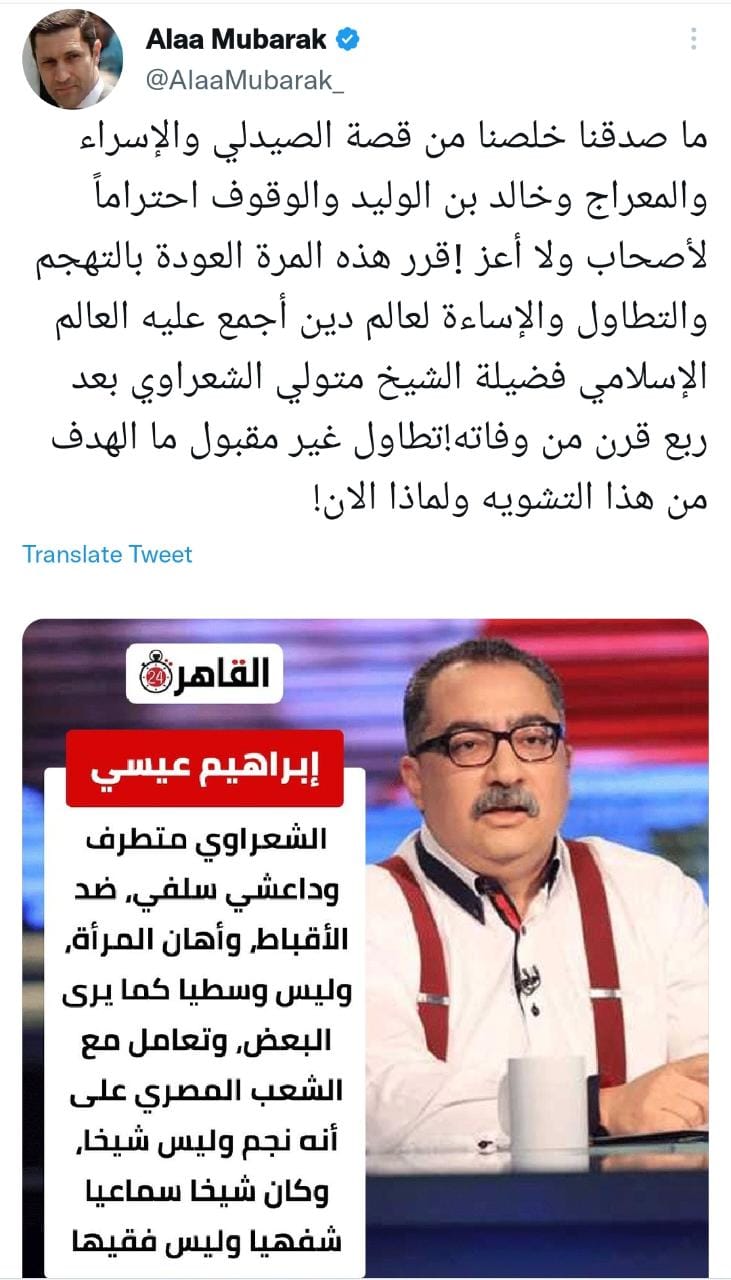 علاء مبارك يرد على تصريحات إبراهيم عيسى عن الشعراوي