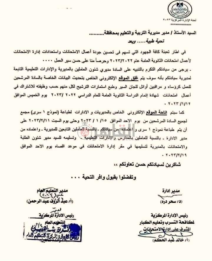 الأعمال لامتحانات الثانوية العامة عام 2022-2023، وذلك حرصًا على حسن سير العمل، منبهة على مديري شئون العاملين بالمديرية والإدارات التعليمية التابعة، بأنه سوف يتم غلق الموقع الإلكتروني الخاص بتحديث البيانات الخاصة بالمرشحين للعمل كرؤساء ومراقبين أوائل للجان السير، وطبع استمارات الترشيح لكل منهم حسب وظيفته، للاشتراك في أعمال امتحانات شهادة إتمام الدراسة الثانوية العامة للعام الدراسي 2022-2023، يوم الخميس الموافق 12 يناير 2023.