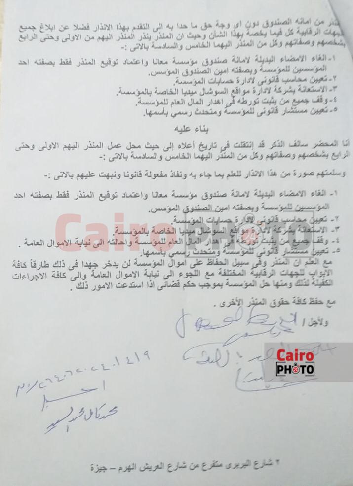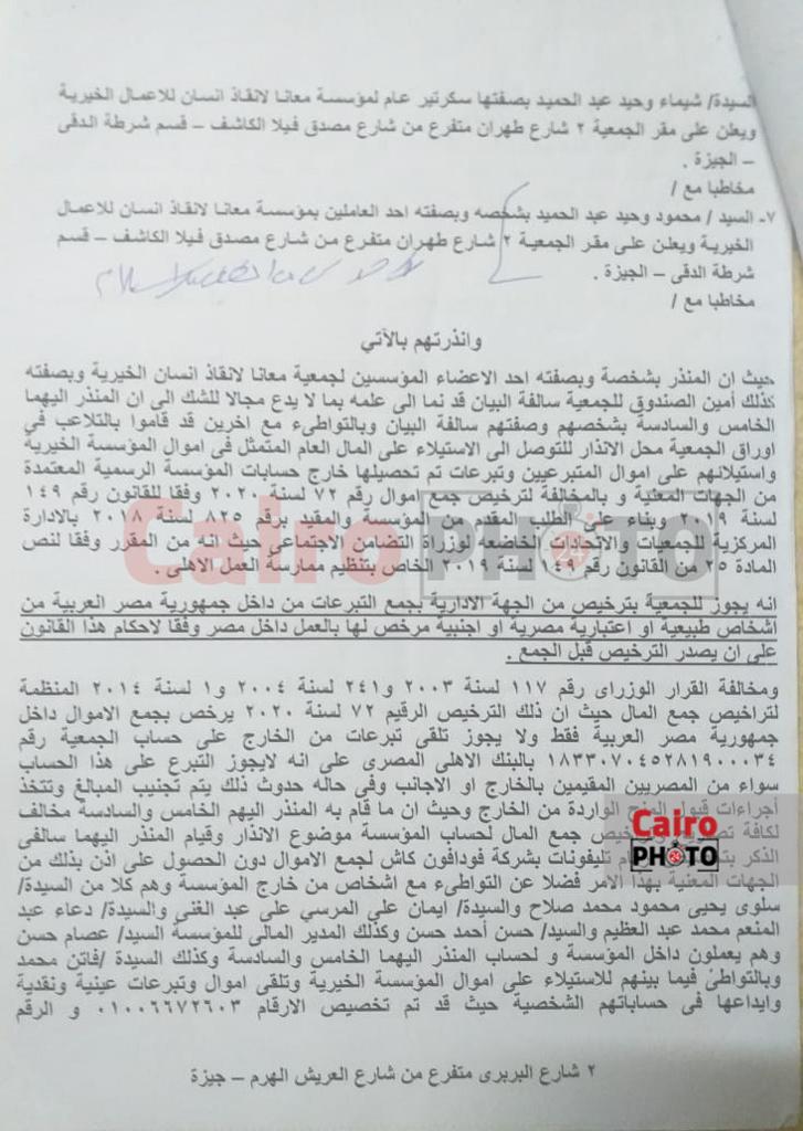 وحصل القاهرة 24، على صورة من الإنذار الرسمي، الذي قدمه زهران إلى وزارة التضامن الاجتماعي، برئاسة نيفين القباج، حيث اتهم زهران، في إنذاره، كلًا من محمود وحيد، رئيس المؤسسة، وشيماء وحيد، سكرتير عام المؤسسة، بالتواطؤ مع آخرين قاموا بالتلاعب في أوراق الجمعية محل الإنذار، للتوصل إلى الاستيلاء على المال العام - المتمثل في أموال المؤسسة الخيرية تحصيلها خارج حسابات المؤسسة الرسمية المعتمدة، واستيلائهم على أموال المتبرعين وتبرعات من الجهات المعنية، بالمخالفة مع ترخيص جمع الأموال رقم 72 لسنة 2020 ووفقا للقانون رقم 149 لسنة 2019، مضيفًا أنهم قاموا بتخصيص أرقام تليفونات بشركة فودافون كاش لجمع الأموال دون الحصول على إذن بذلك من الجهات المعنية، فضلًا عن التواطؤ مع أشخاص من خارج المؤسسة وآخرين يعملون بداخلها، للاستيلاء على أموال المؤسسة الخيرية، وتلقي أموال وتبرعات عينية ونقدية وإيداعها في حساباتهم الشخصية.
