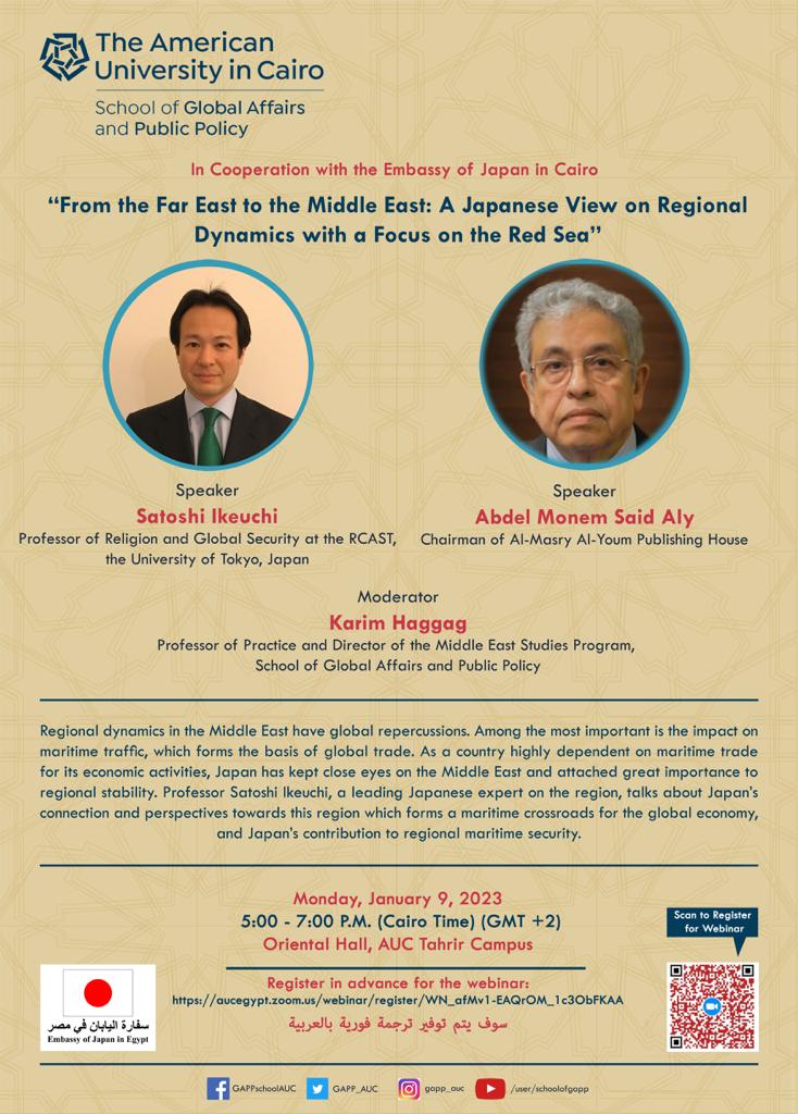 وستناقش الندوة علاقة اليابان ومنظورها تجاه الشرق الأوسط كطريق بحري هام للاقتصاد العالمي، وسيتحدث في المحاضرة الدكتور ساتوشي إيكوتشي مفكر وأستاذ قسم الأديان والأمن العالمي في مركز أبحاث العلوم والتكنولوجيا المتقدمة (RCAST) بجامعة طوكيو، والدكتور عبد المنعم سعيد الكاتب والمفكر السياسي، حيث يدير الحوار كريم حجاج، أستاذ السياسة العامة والإدارة بالجامعة الأمريكية بالقاهرة وتعقد المحاضرة باللغة الإنجليزية مع وجود ترجمة فورية إلى اللغة العربية.