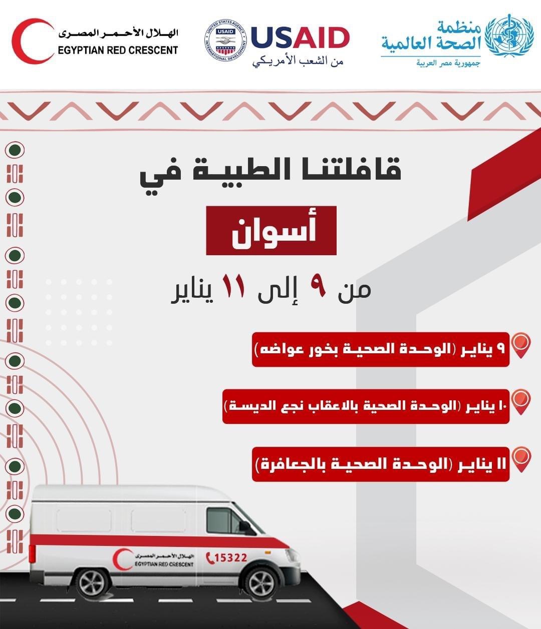 أعلنت جمعية الهلال الأحمر المصري، التابعة لوزارة التضامن الاجتماعي، بالتعاون مع منظمة الصحة العالمية في مصر، تنظيم قافلة طبية شاملة في محافظة أسوان، وذلك إيمانا بأهمية الدور المجتمعي للمؤسسات والجمعيات الغير حكومية.