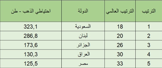 ويوضح الجدول التالي، وفقا للأرقام الصادرة عن مجلس الذهب العالمي، ترتيب أكبر الدول العربية حيازة لاحتياطي الذهب، ترتيبها عربيا وعلى المستوى العالمي: