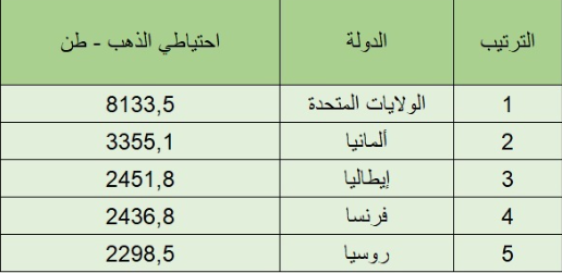 وأوضح التقرير أن الولايات المتحدة تصدرت دول العالم باحتياطيات المعدن النفيس، حيث بلغت 8133.5 طن، تليها ألمانيا باحتياطيات وصلت إلى 3355.1 طن في المركز الثاني، فيما جاءت روسيا في المركز الخامس باحتياطيات بلغت 2298.5 طن. وفيما يلي قائمة بأكبر دول العالم امتلاكا للمعدن الأصفر: