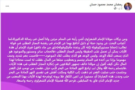 وأضاف عميد كلية الدراسات الإسلامي، عبر صفحته الرسمية بموقع التواصل الاجتماعي فيسبوك، فأصبت بغم شديد ونمت مهموما، وإذا بي أجده في المنام يبتسم ويعطيني مبلغا من المال، فقلت له لست محتاجا لهذا المال، لكن كيف أقول إن مولانا خالف جمهور البلاغيين في إنكاره المجاز العقلي في هذه الآيات، فابتسم رحمه الله وقال لي: راجع النهر المادة من البحر لأبي حيان، فقمت من نومي قبل الفجر، وجلست حتى صليت الفجر ثم ذهبت إلى الكلية ومكثت أفتش في تفسير النهر المادة من البحر حتى وجدت هذه العبارة(أي مستورا عن أعين الكفار فلا يرونه) وشرحه لهذه الآيات بهذا المعنى من جديد الإمام الذي فاق به السابقين، فرحم الله فضيلة الإمام الشعراوي رحمه واسعة.
