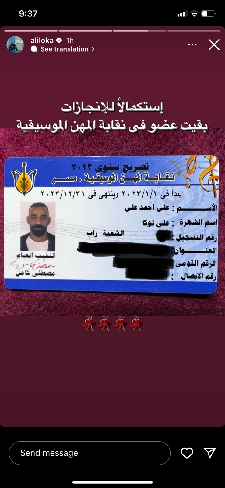 ونشر مطرب الراب علي لوكا صورة الكارنية، وذلك من خلال خاصية ستوري بحسابه الشخصي بموقع الصور والفيديوهات إنستجرام، معلقًا: استكمالًا للإنجازات، بقيت عضو في نقابة المهن الموسيقية.
