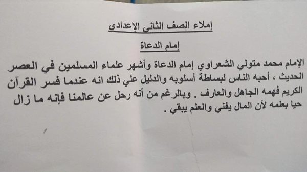 وجاء في الامتحان تحت عنوان إمام الدعاة: الإمام محمد متولي الشعراوي، إمام الدعاة وأشهر علماء المسلمين في العصر الحديث، أحبه الناس لبساطة أسلوبه، والدليل على ذلك أنه عندما فسّر القرآن الكريم فهمه الجاهل والعارف، وبالرغم من أنه رحل عن عالمنا، فإنه ما زال حيًا بعلمه لأن المال يفنى والعلم يبقى.
