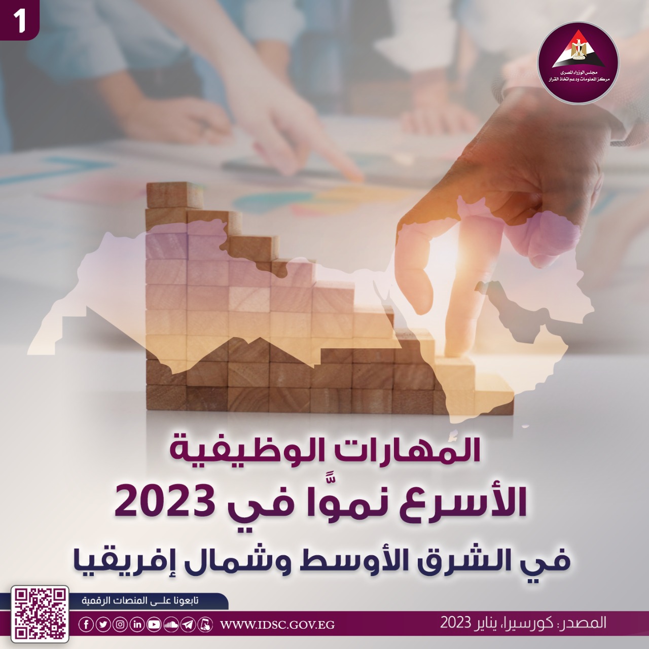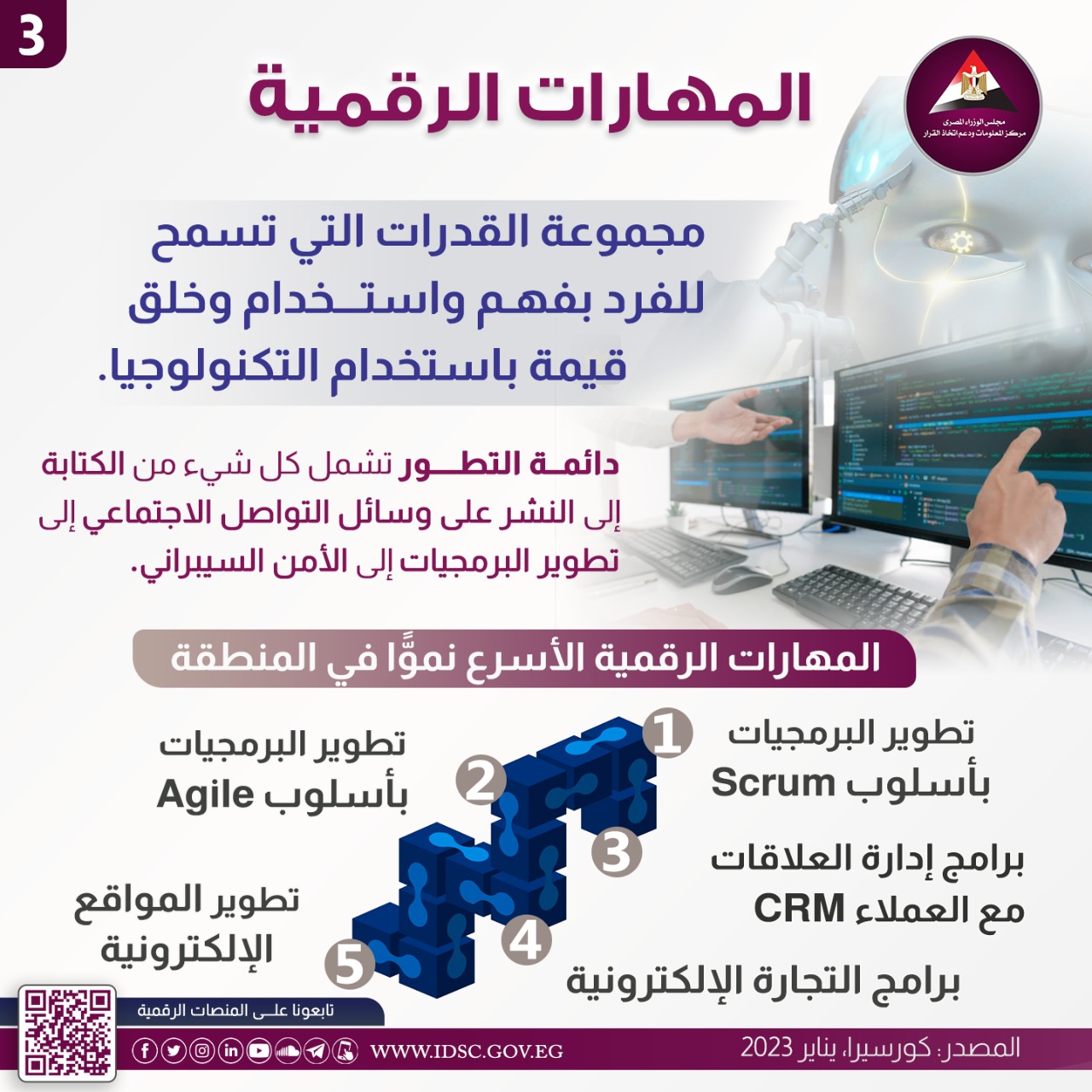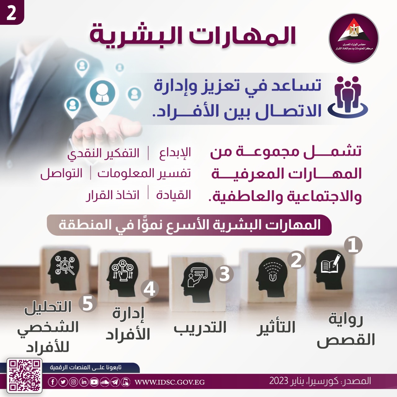 نشر مركز المعلومات ودعم اتخاذ القرار، التابع لـ مجلس الوزراء، انفوجراف، يؤكد خلاله أن المهارات الوظيفية الرقمية الأسرع نموًا عن المهارات البشرية، ولكن المهارات البشرية أكثر استثمارًا واستقرارًا، نظرًا لقلة تأثرها بالتنوع التكنولوجي.