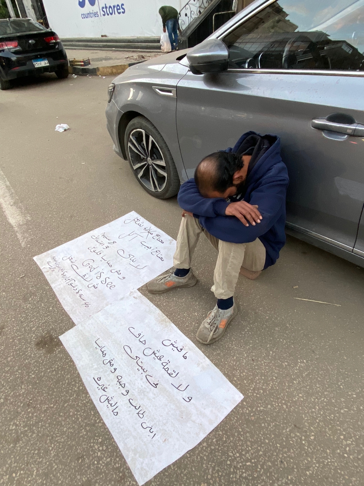 بنظرات كلها حزن ويأس وفقدان الأمل، يجلس ي.ش، البالغ من العمر 40 عامًا، بيافطة على الأرض مكتوبًا عليها مفيش ولا لقمة عيش حاف في بيتي، ابني طالب وجبة ومش معايا.. ومليش غيره، مش محتاج مساعدة.. محتاج شغل وأجيب أكل لابني ومش معايا فلوس، ومش لاقي شغل، God is see، باحثًا عن فرصة عمل.
