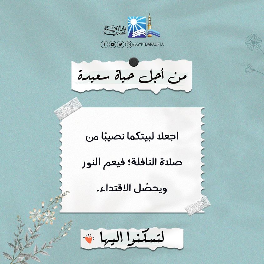 وجّهت دار الإفتاء المصرية، نصائح للأزواج، قائلة: اجعلا لبيتكما نصيبًا من صلاة النافلة؛ فيعم النور ويحصُل الاقتداء.