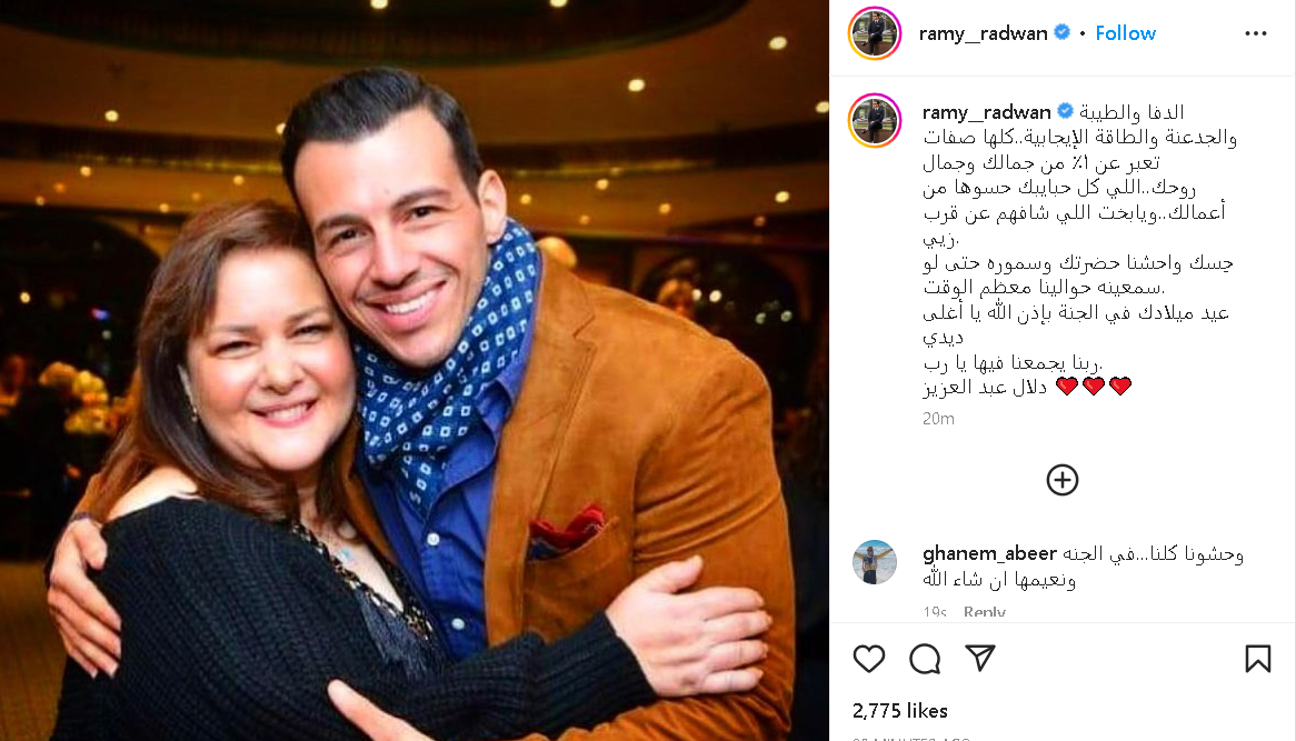 ونشر رامي رضوان، صورة جمعته بالراحلة دلال عبد العزيز، عبر حسابه الشخصي بموقع تبادل الصور والفيديوهات إنستجرام، وعلق قائلًا: الدفا والطيبة والجدعنة والطاقة الإيجابية.. كلها صفات تعبر عن 1% من جمالك وجمال روحك.. اللي كل حبايبك حسوها من أعمالك.. ويا بخت اللي شافهم عن قرب زيي.