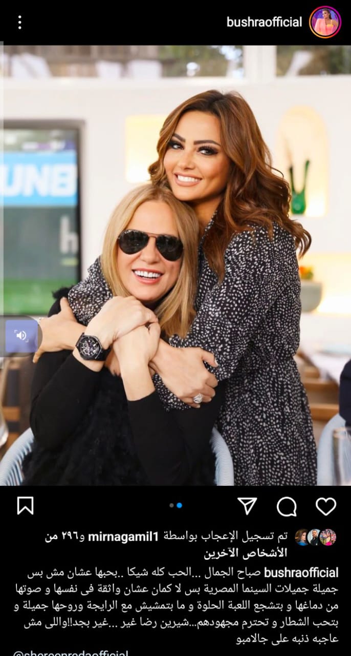 وكتبت بشرى منشورًا، عبر حسابها الشخصي بموقع انستجرام، قالت فيه: صباح الجمال.. الحب كله شيكا، بحبها عشان مش بس جميلة جميلات السينما المصرية، بس لأ كمان عشان واثقة في نفسها وصوتها من دماغها، وبتشجع اللعبة الحلوة، ومابتمشيش مع الرايحة والجاية، وروحها جميلة، بتحب الشطار وتحترم مجهودهم.. شيرين رضا غير.