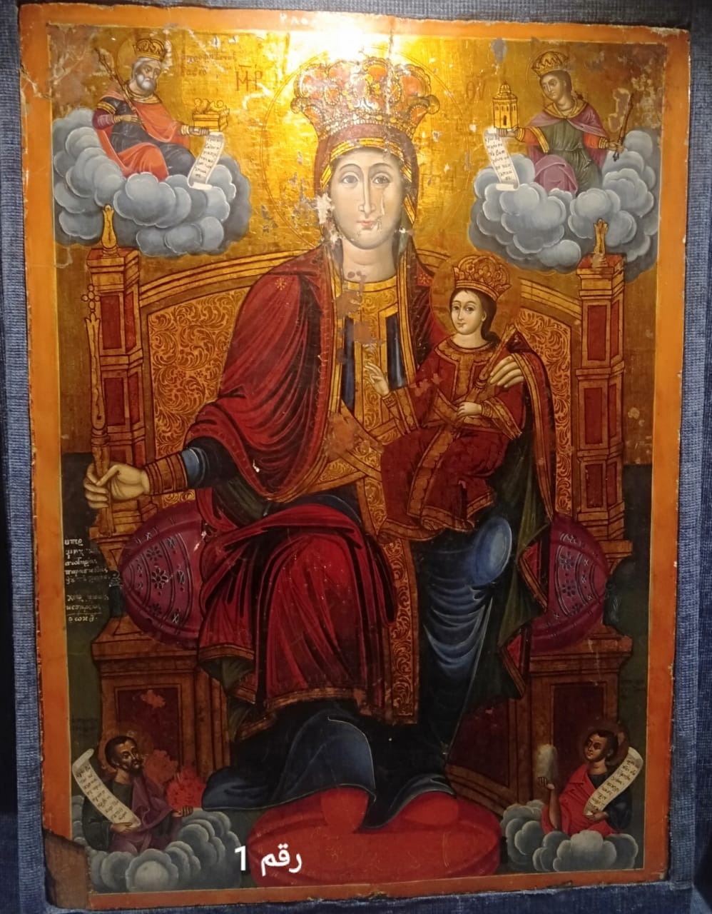 - أيقونة السيدة العذراء وتحمل هذه الأيقونة إمضاء يعقوب القيصري صورت السيدة العذراء بوضعية تسمى العذراء الملكة وتحمل السيد المسيح متوجا، وصور على الزوايا الأربع للأيقونة أربعة شخصيات من العهد القديم.