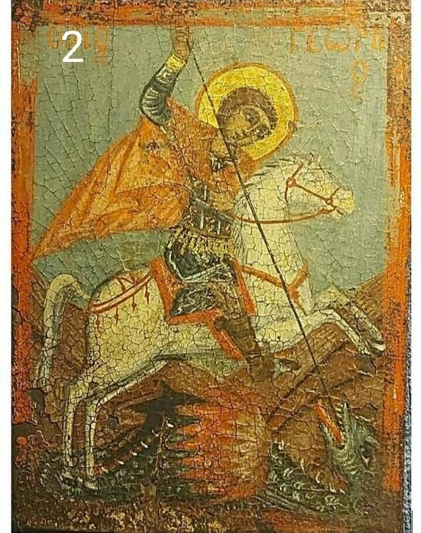 - أيقونة مصور عليها القديس مارجرجس ممتطيا جواده ويطعن التنين بالحربة، ويظهر على الأيقونة كتابات قبطية وتلك الصورة من الصور المشهورة في الفن المسيحي تمثل انتصار الخير على الشر، وتعود القطعة إلى العصر الروماني المتأخر، وصُعت من الخشب الملون.