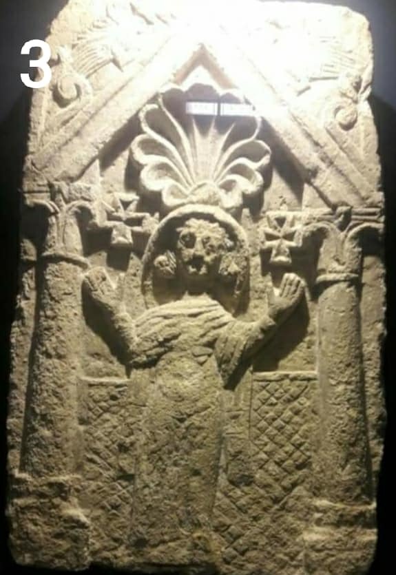 - شاهد قبر يصور سيدة يعلوها شكل صدفة وعلى جانبيها عمودان يعلوهما جمالون وعلى جانبي الرأس نقش على شكل صليب وعلى جانبي الجمالون طائران خرافيان كلاهما يمسك بفرع نباتي، وتعود القطعة إلى العصر الروماني المتأخر، وصُنعت من الحجر الجيري.
