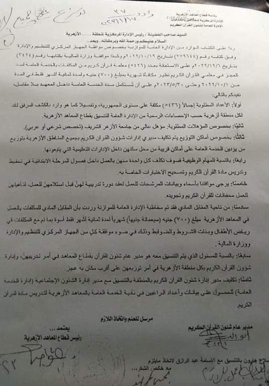ويُستعان بهؤلاء المحفظات نظير مكافأة شهرية قدرها 700 جنيه، ولمدة ثمانية أشهر فقط في المدة من 1 / 10/ 2022 حتى 30 /5 2023، على أن تستكمل مدة الخدمة العامة داخل المعهد بلا مقابل.