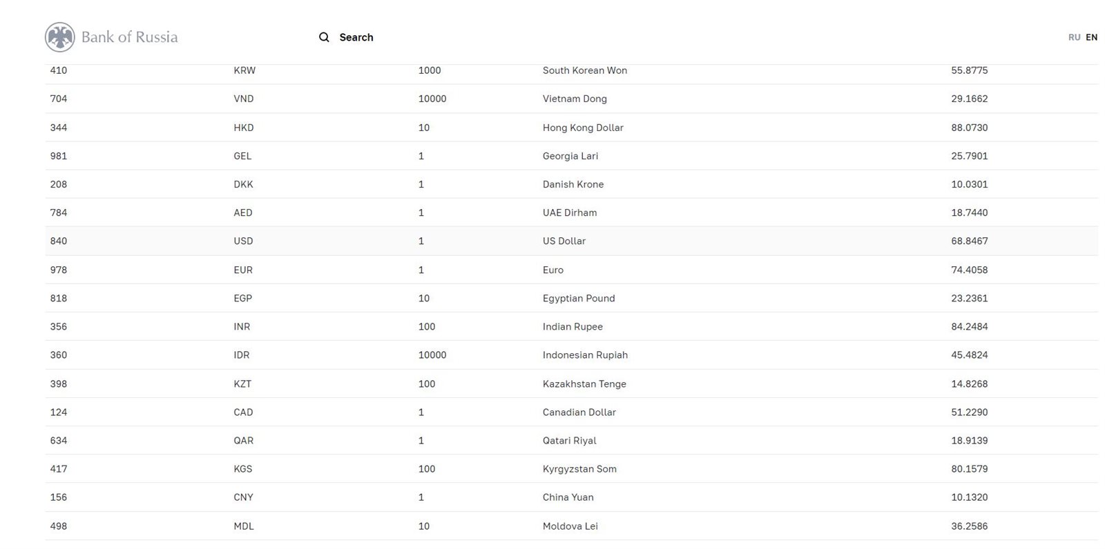 وفي وقت سابق، حدد البنك المركزي الروسي الأسعار الرسمية للعملات المذكورة مقابل الروبل اعتبارًا من 18 يناير 2023، موضحًا أنه تم إدراج الدرهم الإماراتي والريال القطري والجنيه المصري والبات التايلندي والدونغ الفيتنامي والدينار الصربي والدولار النيوزيلندي واللاري الجورجي والروبية الإندونيسية، في قائمة العملات الأجنبية، مع أسعارها الرسمية مقابل الروبل التي حددها بنك روسيا.