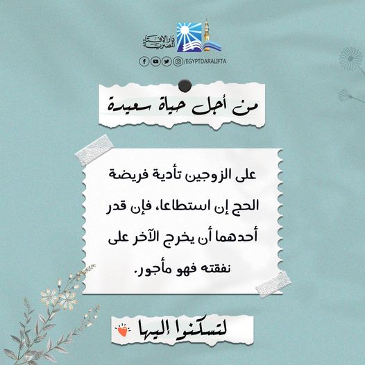 وفي وقت سابق، كانت دار الإفتاء حذرت الأزواج، ضمن حملتها الإلكترونية: لتسكنوا إليها، من الغياب والسهر والتأخير المستمر خارج المنزل دون أسباب تقتضي ذلك.