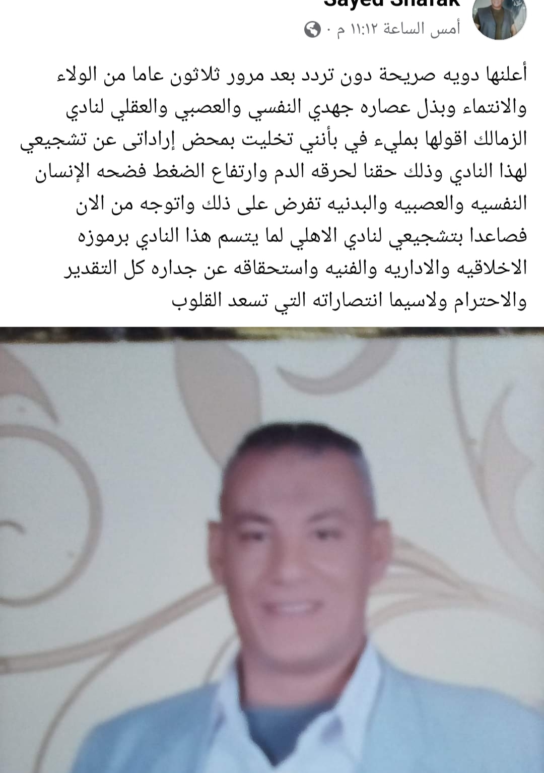 وكتب سيد شفيق، مشجع نادي الزمالك على حسابه الشخصي على موقع التواصل الاجتماعي فيس بوك، وبعض الجروبات: أعلنها دوية صريحة دون تردد، بعد مرور 30 عامًا من الولاء والانتماء وبذل عصارة جهدي النفسي والعصبي والعقلي لنادي الزمالك، أقولها بملء فمي، بأنني تخليت بمحض إراداتي عن تشجيعي لهذا النادي، وذلك حقنا لحرقة الدم وارتفاع الضغط، فصحة الإنسان النفسية والعصبية والبدنية تفرض عليه ذلك، وأتوجه من الآن فصاعدًا بتشجيعي لنادي الأهلي، لما يتسم هذا النادي برموزه الأخلاقية والإدارية والفنية، واستحقاقه عن جدارة كل التقدير والاحترام، لاسيما انتصاراته التي تسعد القلوب.