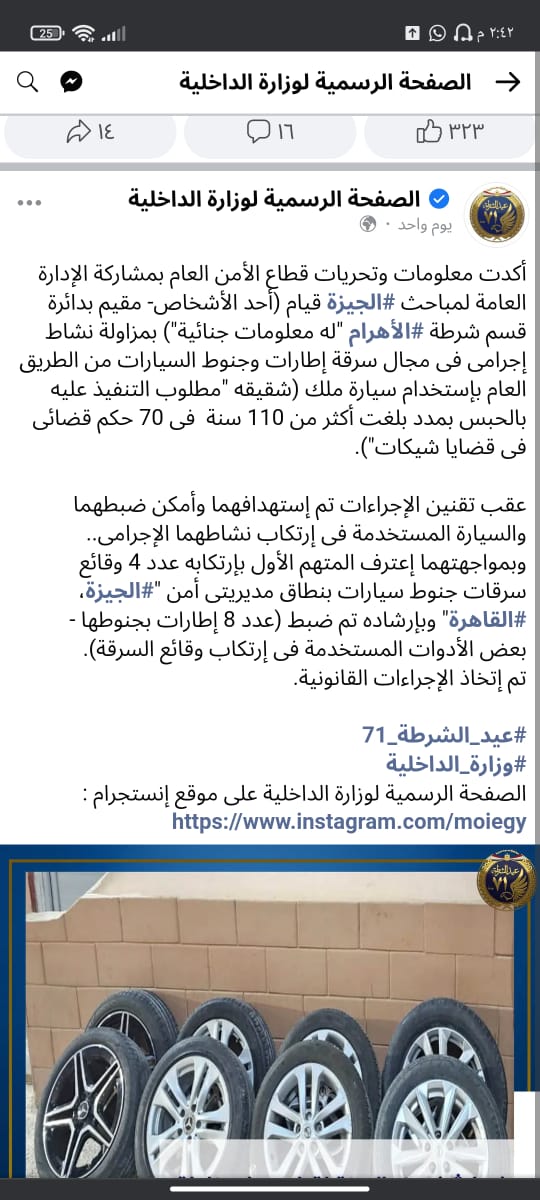 وفي هذا الصدد، ألقى قطاع الأمن العام بالتعاون مع مباحث أمن الجيزة القبض في الفترة الأخيرة على أكثر من شخص؛ لمزاولته نشاطا إجراميا في مجال سرقة الإطارات وجنوط السيارات وبيعها.
