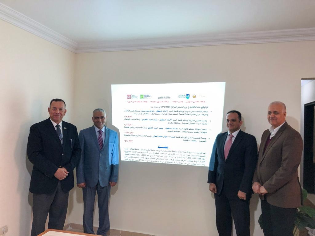 وجاء توقيع اتفاقية التعاون على هامش الاجتماع الذي استضافته جامعة المنصورة الجديدة، بحضور الدكتور معوض الخولي رئيس جامعة المنصورة الجديدة، والدكتور أشرف حسين رئيس جامعة الملك سلمان الدولية، والدكتور عصام الكردي رئيس جامعة العلمين الدولية، والدكتور محمد الشناوي القائم بأعمال رئيس جامعة الجلالة.
