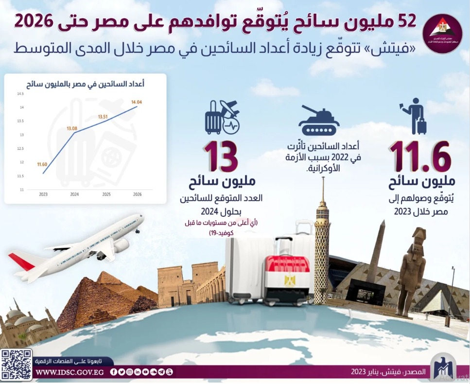 نشر مركز المعلومات ودعم اتخاذ القرار بـ مجلس الوزراء، انفوجراف، يرصد خلاله توقعات مؤسسة فيتش سوليوشنز الأخيرة، حول مستقبل السياحة في مصر خلال الفترة المقبلة حتى 2026؛ إذ تتوقع فيتش؛ زيادة أعداد السائحين في مصر على المدى المتوسط، بسبب توقعات تراجع تداعيات الحرب الروسية الأوكرانية، وتراجع القيود المرتبطة بمواجهة فيروس كوفيد-19.