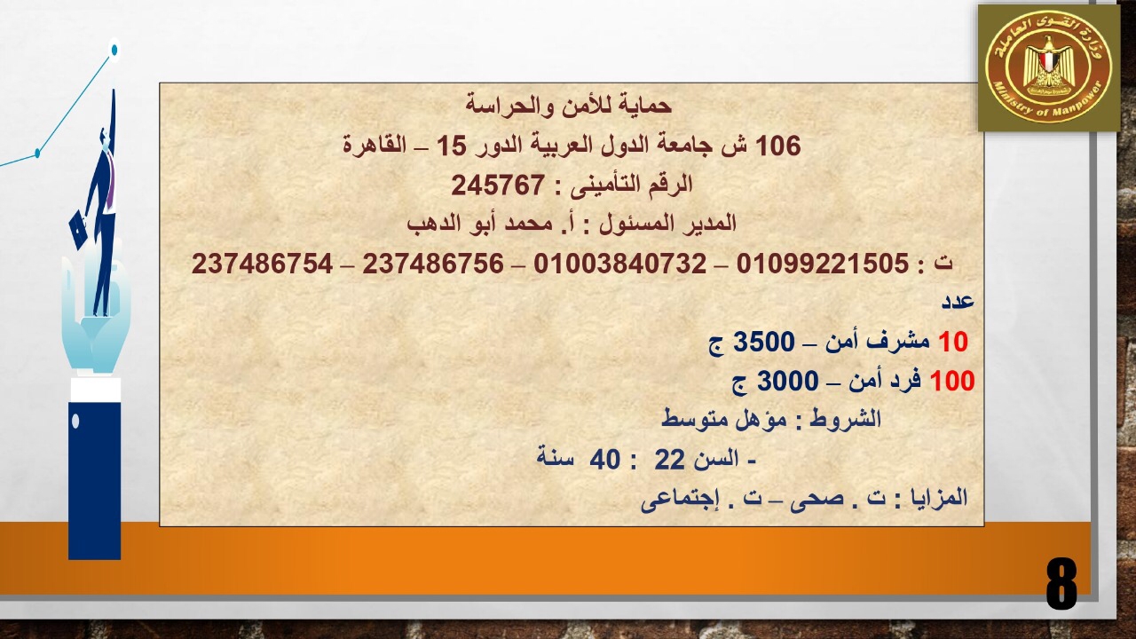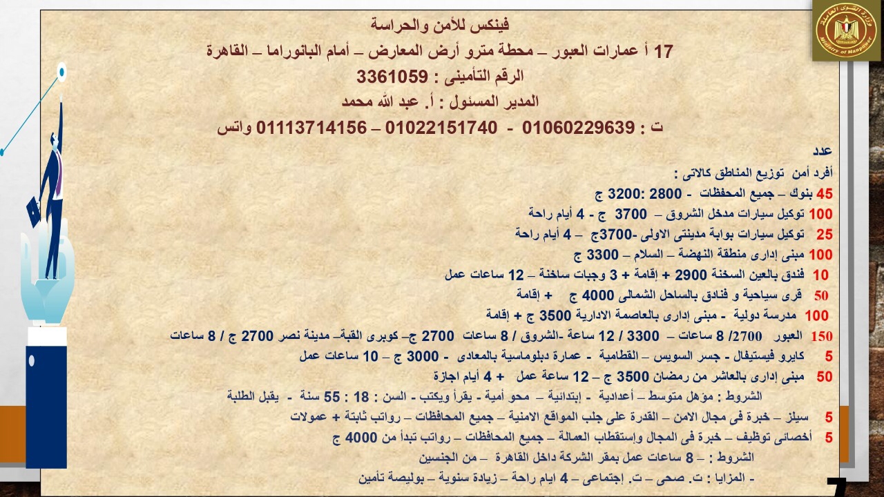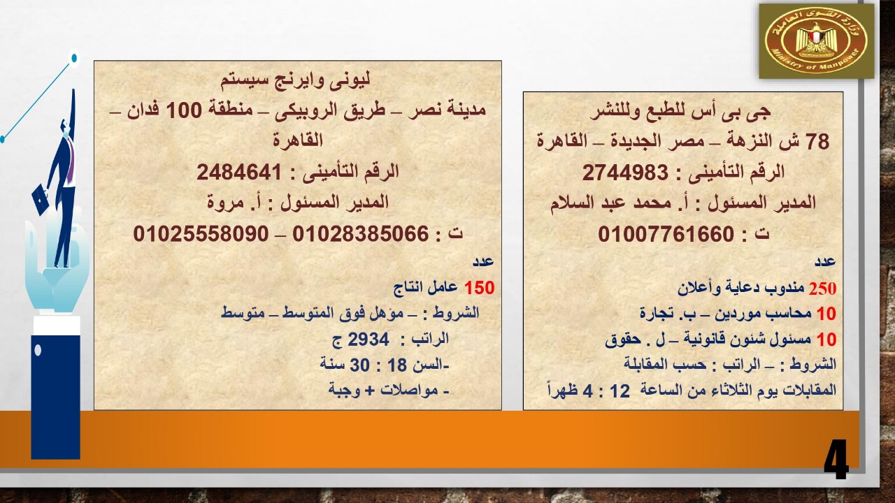 وطالبت شركة للطباعة والنشر 250 مندوب دعاية وإعلان، 150 عامل إنتاج على أن تكون الشروط مؤهل فوق المتوسط - متوسط، كما طالبت 10 محاسبين موردين، بالإضافة إلى 10 مسئولين شئون قانونية.