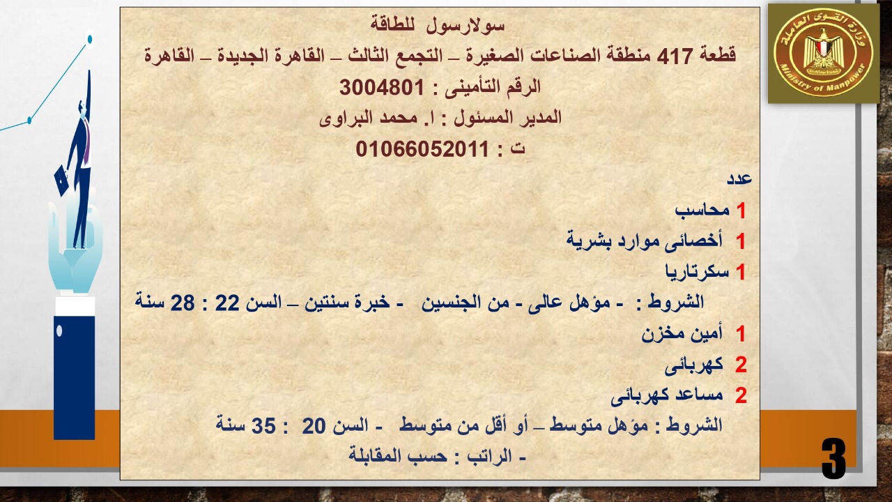 وطالبت شركة للطاقة عدد 1 محاسب، 1 أخصائي موارد بشرية، 1 سكرتاريا، بشرط أن يكون المؤهل عالي - من الجنسين، وخبرة سنتين، والسن من 22 حتى 28 سنة، كما طالبت 1 أمين مخزن، 2 كهربائي، 2 مساعد كهربائي، شرط أن يكون المؤهل متوسط - أو أقل من متوسط، والسن من 20 حتى 35 سنة.