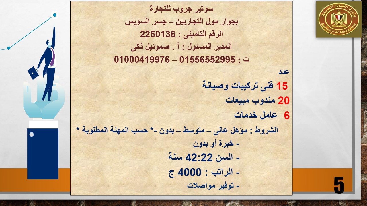 وطالبت شركة تجارية 15 فني تركيبات وصيانة، و20 مندوب مبيعات، و6 عمال خدمات، على أن تكون الشروط مؤهل عالي أو متوسط أو بدون، والسن من 22 إلى 42 عامًا، والراتب 4000 جنيه فضلًا عن توفير المواصلات.