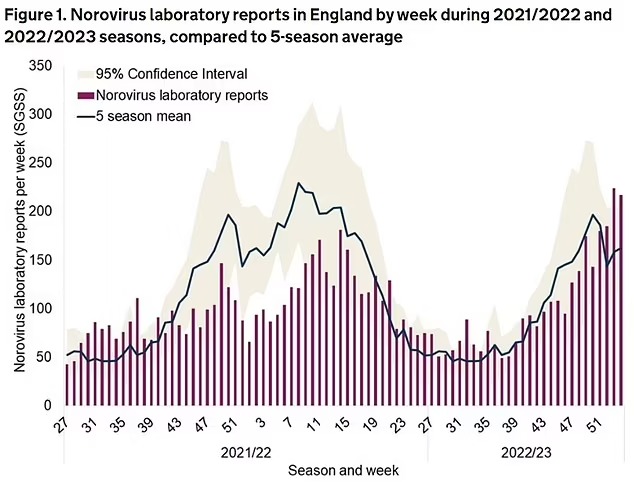 ووفقً لبيانات هيئة الخدمات الصحية البريطانية، تشهد المملكة خلال هذا الأسبوع ارتفاع في عدد الإصابات بـ نوروفيروس بالمقارنة بالأسبوع الذي يسبقه، حيث سجلت بمتوسط 371 حالة خلال يوم واحد، كما أنها تشهد ارتفاع في هذا الموسم لم يسبق تسجيله خلال السنوات الماضية، وهو ضعف الأعداد التي سُجلت العام الماضي.
