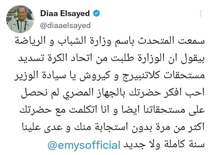 وكتب ضياء السيد المدرب العام السابق لمنتخب مصر، عبر حسابه على موقع التواصل الاجتماعي تويتر: سمعت المتحدث باسم وزارة الشباب والرياضة بيقول إن الوزارة طلبت من اتحاد الكرة تسديد مستحقات كلاتنبيرج وکیروش، يا سيادة الوزير أحب افكر حضرتك بالجهاز المصري لم نحصل على مستحقاتنا أيضًا وأنا تكلمت مع حضرتك أكثر من مرة بدون استجابة منك وعدى علينا، سنة كاملة ولا جديد.