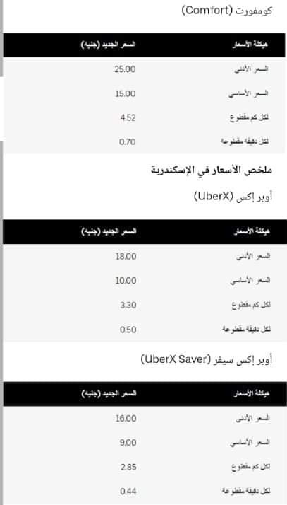 وفي الإسكندرية؛ رفعت شركة أوبر أسعار خدمة أوبر إكس UberX لتصبح بداية الرحلة عند 10 جنيهات، والحد الأدنى للرحلة 18 جنيه، وسعر الكيلو المقطوع بـ3.30 جنيه، ودقيقة الانتظار مقابل 0.50 جنيه.