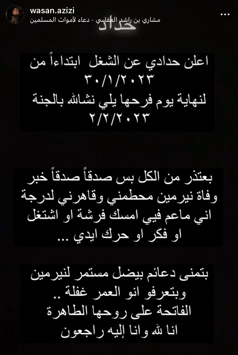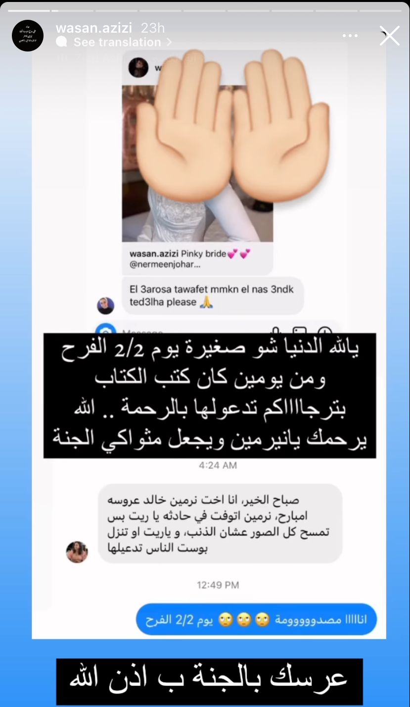 وكتبت وسن، العمر غفلة يا جماعة والموت أقرب إلينا من حبل الوريد. صبية بعمر الورد قمة الأدب والخجل والاحترام هي وعائلتها.. كان كتب كتابها يوم 27 يناير 2023، وعملت لها الميك أب وكانت شبه القمر وحاجزة معايا ليوم الفرح 2 فبراير 2023، ولكن ما لحقت تكون عروسة بالدنيا إن شاء الله تكون عروسة في الآخرة.