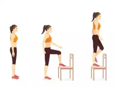 يستهدف هذا التمرين عضلات الجزء السفلي من الجسم، ويمكن القيام به من خلال الصعود على سطح مرتفع مثل كرسي صلب أو صندوق ثقيل، وعليك أن تخطو على تلك السطح بقدمك اليمنى مع الحفاظ على وضع القدم اليسرى مسطحة وثابتة على الأرض.