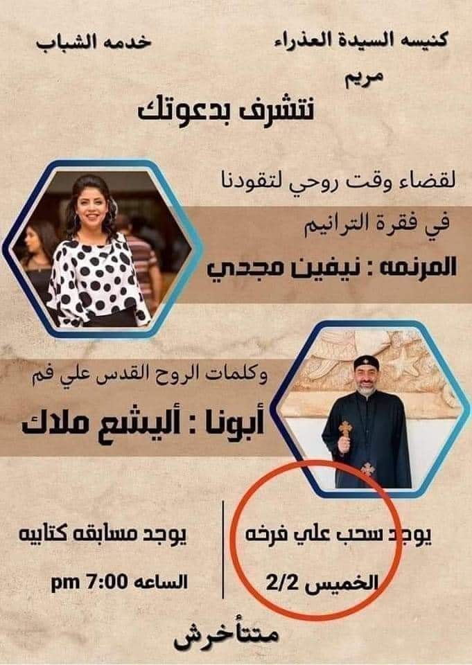 ويظهر في البوستر اسم كنيسة العذراء مريم، وبجوارها عبارة رعاية الشباب، وجاء في البوستر دعوة لقضاء وقت روحي في فقرة ترانيم للمرنمة نيفين مجدي، وكلمات الروح القدس على فم ابونا أليشع ملاك، وفي نهاية الدعوة، تم التنوية على سحب فرخة وذلك في اليوم المقرر 2/2، ومسابقة كتابية.