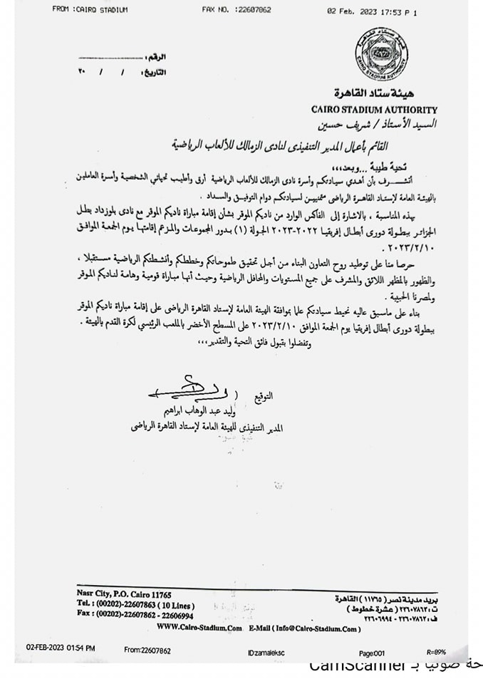 وعبر حسابه الرسمي على موقع التواصل الاجتماعي فيس بوك، نشر مرتضى منصور رئيس مجلس إدارة نادي الزمالك صورة من خطاب هيئة استاد القاهرة، والمتضمن الموافقة على استقبال مباراة شباب بلوزداد المقررة يوم 10 فبراير المقبل، ضمن منافسات دور المجموعات ببطولة دوري أبطال إفريقيا.