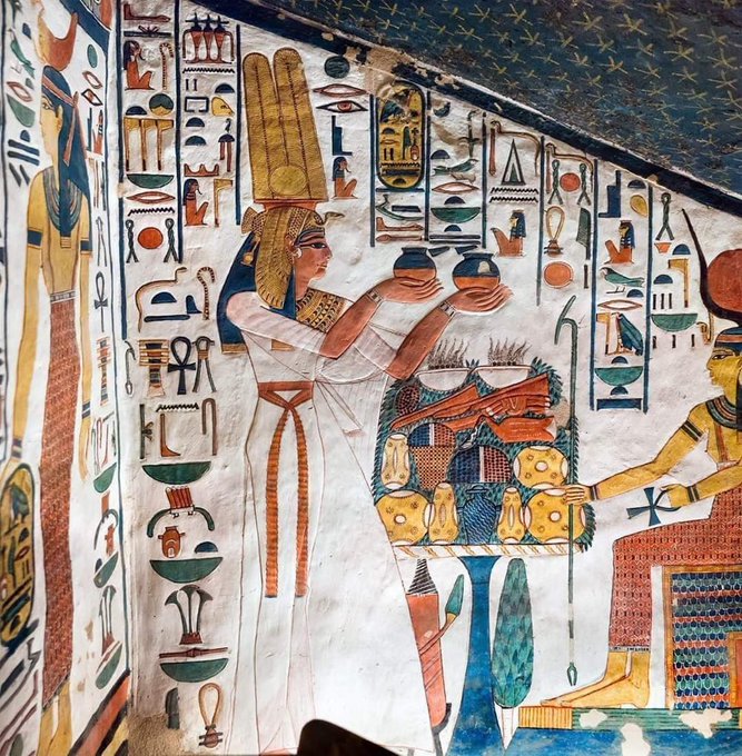 وتزين جميع جدران المقبرة نقوش وجداريات ذات جمال لا يضاهي حيث تمثل الملكة نفرتاري وهي تتلقى الإرشاد والتوجيه من الآلهة.