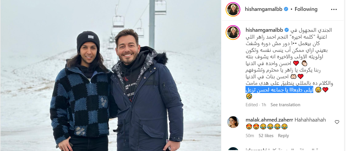 ونشر هشام جمال صورة عبر حسابه الشخصي على موقع تبادل الصور والفيديوهات إنستجرام، يشكر من خلالها الفنان أحمد زاهر على جهده أثناء تصوير أغنية كلمة أخيرة التي طُرحت مؤخرًا لـ ليلى أحمد زاهر.