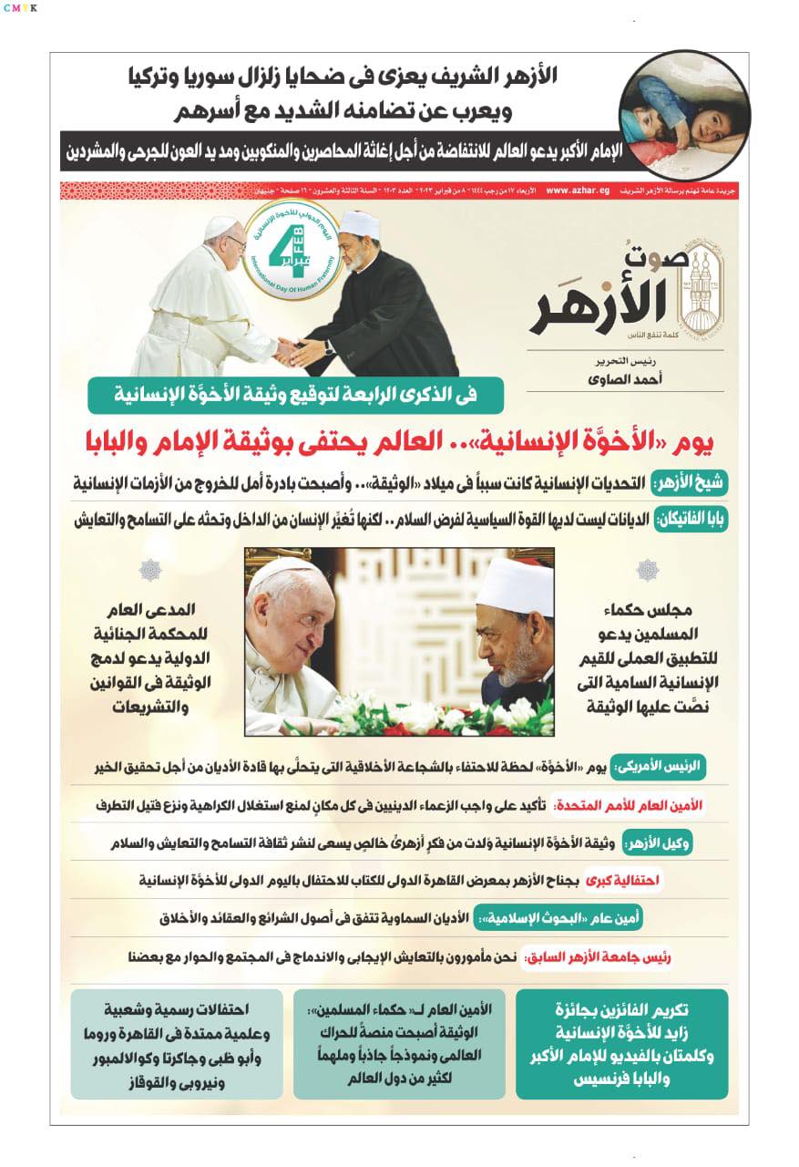 سلطت جريدة صوت الأزهر، الناطقة باسم الأزهر الشريف، خلال عددها الجديد، الضوء على الذكرى الرابعة لتوقيع وثيقة الأخوَّة الإنسانية، التي وقعها الإمام الأكبر الدكتور أحمد الطيب، شيخ الأزهر الشريف، رئيس مجلس حكماء المسلمين، والبابا فرنسيس، بابا الكنيسة الكاثوليكية، في 4 فبراير 2019.