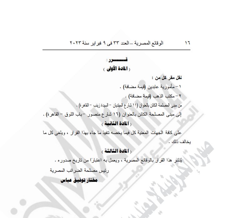 قرر مختار توفيق رئيس مصلحة الضرائب نقل مكتب ضرائب الذهب -قيمة مضافة، ومأمورية ضرائب عابدين -قيمة مضافة، من مبنى مصلحة الضرائب في 11 شارع البستان بالسيدة زينب في القاهرة، إلى مبنى مصلحة الضرائب في 16 شارع منصور باب اللوق القاهرة.