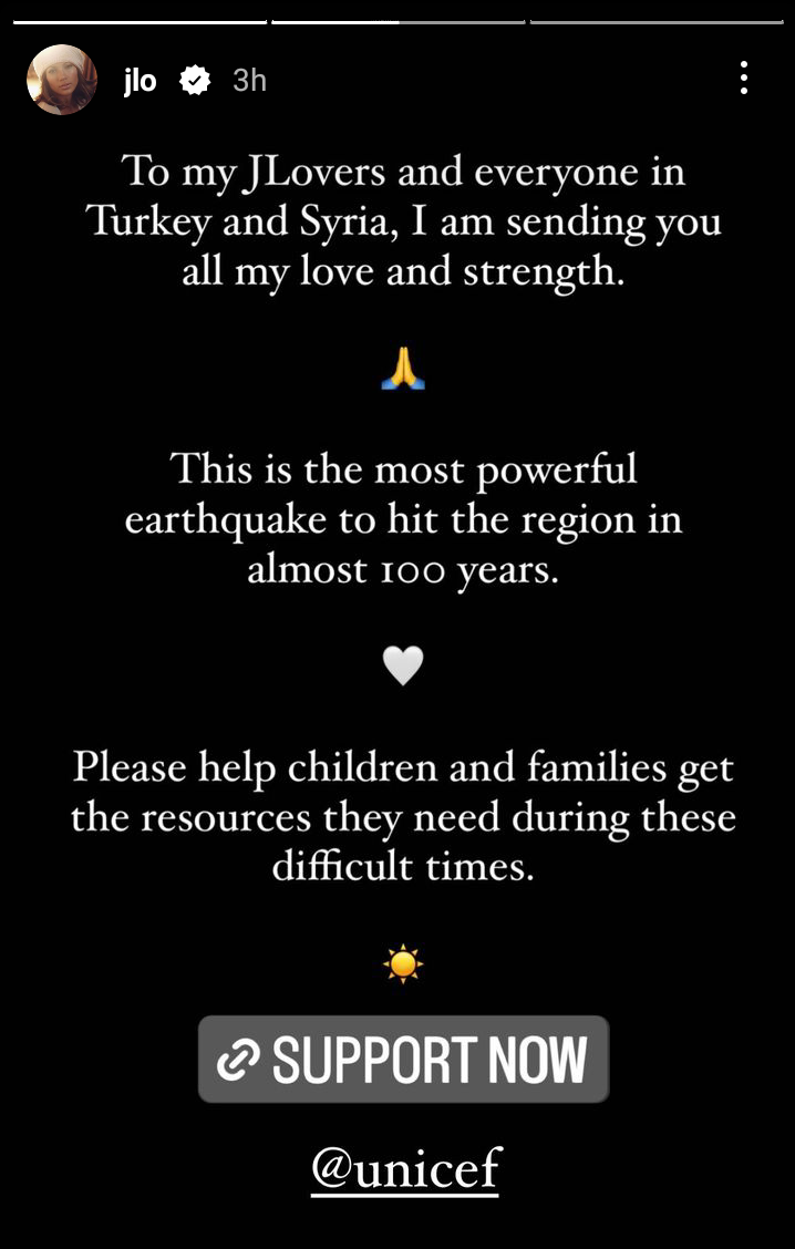ودعت جينيفر لوبيز جمهورها بضرورة تقديم الدعم إلى والتبرعات لجهود الإنقاذ وضحايا الزلزال في تركيا وسوريا، والذي خلف آلاف الضحايا والمصابين.