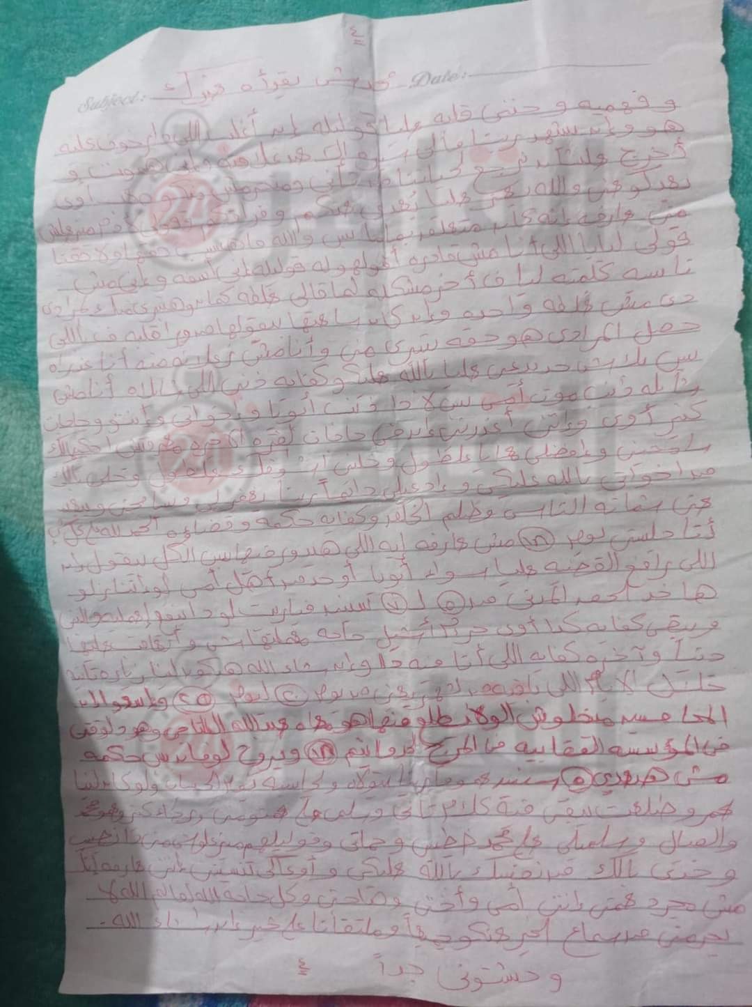 وقالت نورهان في خطابها مش عارفه أكتب لك إيه ولا إيه ولا ابدأ منين جوايا كلام كثير عايزه أتكلم فيه معاكي وأحكي لك كل اللي جوايا زي ما كنا على طول، أنا شايفة أن الكل ضدي في الفترة الأخيرة طالبة منك الدعاء ليا أنا بنتك وأنت أقرب حد ليا، جيت هنا بحاسب على حاجة ما عملتهاش بس مقتنعة أن هنا بيكفر عني ذنوب تانية عملتها في حياتي وراضية بحكم ربنا وصابرة، لكن صبري وطقتي انتهت وتعبت وخايفة على أخواتي وبابا وعليكم، وزعلانة على أمي اللي راحت وهي غضبانة عليا.