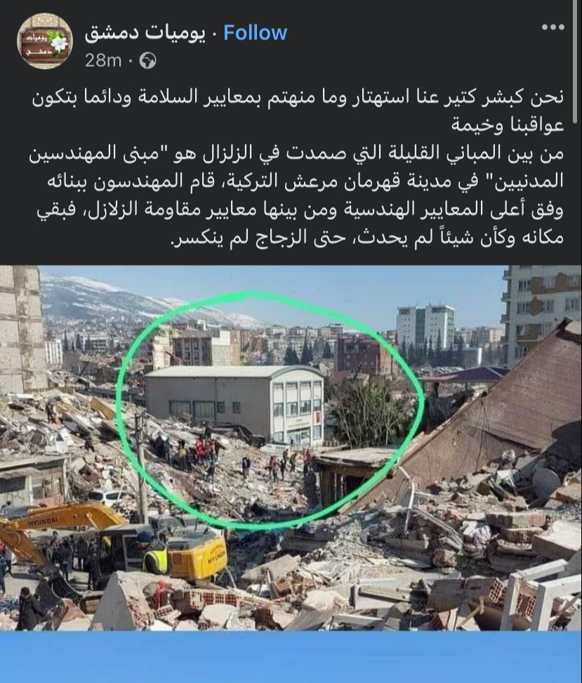 وجاء في منشور آخر، نحن كـ بشر عنا استهتار وما منهتم بمعايير السلامة، ودائمًا تكون العواقب وخيمة.. من بين المباني القليلة التي صمدت في الزلزال هو مبنى المهندسين المدنيين في قهرمان مرعش بتركيا.