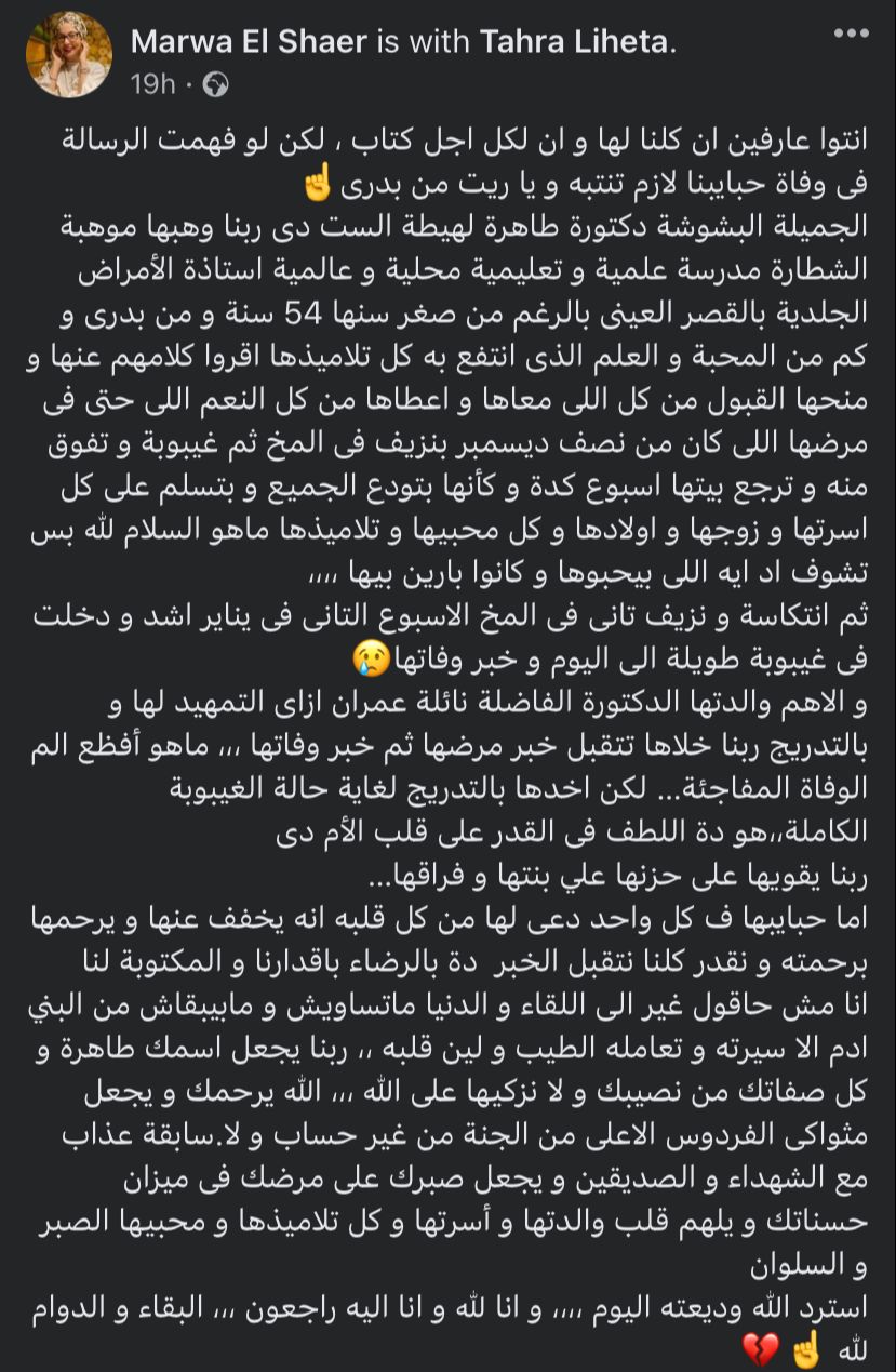 كما نعتها صديقتها مروة الشرع، وكتبت: أنتم عارفين إن كلنا لها وإن لكل أجل كتاب، ولكن لو فهمت الرسالة في وفاة حبايبنا لازم تنتبه وياريت من بدري، الجميلة البشوشة دكتورة طاهرة لهيطة الست دي ربنا وهبها الشطارة، مدرسة علمية وتعليمية محلية وعالمية، أستاذة أمراض الجلدية بالقصر العيني، بالرغم من صغر سنها 54 سنة، إلا أنها كانت تمتلك قدر كبير من العلم.