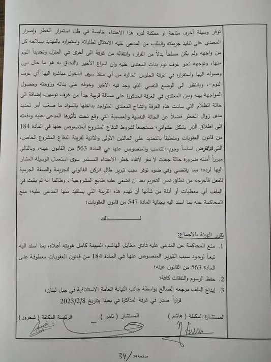 واستكمل قرار المحكمة: ولذلك تقرر الهيئة بالإجماع منع المحاكمة على المدعى عليه فادي مخايل الهاشم، تبعا لوجود سبب التبرير المنصوص عنها في المادة 184 من قانون العقوبات.